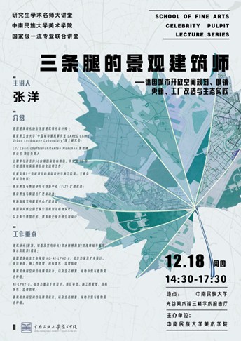 12月18日下午,中南民族大学美术学院国家级一流专业环境设计联合讲堂特邀德国建筑绿化协会注册建筑绿化设计师、慕尼黑工业大学“中国城市景观研究室(LAREG China Urban Landscape Laboratory)”博士研究员张洋先生,以线上直播连线形式,为美院环境设计系师生带来题为《“三条腿”的景观建筑师——德国城市开放空间规划、城镇更新、工厂改造与生态实践》的专题讲座。讲座由美术学院环境艺术设计系主任廖璇老师主持,学院研究生、本科生及部分专业教师共计一百余人集中参与聆听。