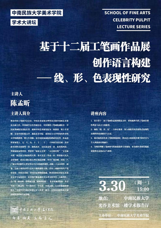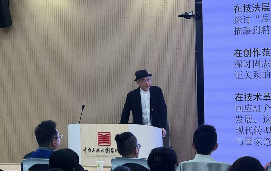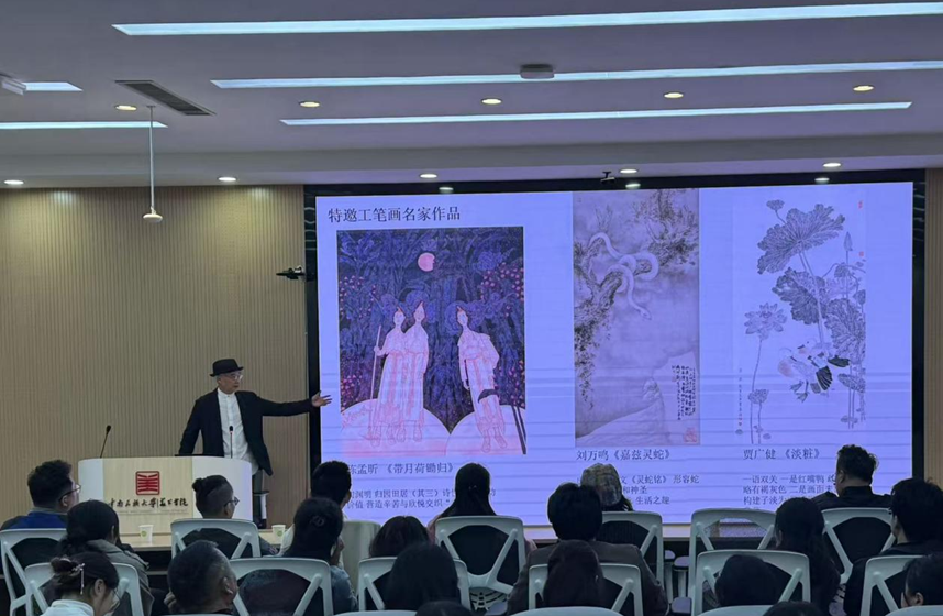 2026年3月30日下午,中南民族大学美术学院学术大讲坛在学术报告厅举行。本次大讲坛邀请湖北美术学院中国画学院副院长熊明非主持,特邀中国工笔画学会会长陈孟昕担任主讲。围绕“基于十二届中国工笔画作品展的创作语言构建-线、形、色表现性研究”这一主题,陈孟昕会长为师生们带来了一场兼具理论深度与实践价值的艺术分享。