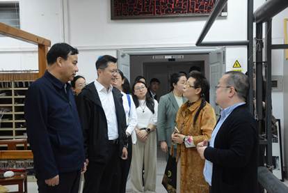 座谈会后,代表团一行还实地参观了学校民族美术国家级实验教学示范中心,详细了解中心在民族文化创意设计、非遗活态传承、文旅融合等领域的科研特色与应用成果,对中心平台建设与成果转化能力给予高度评价。