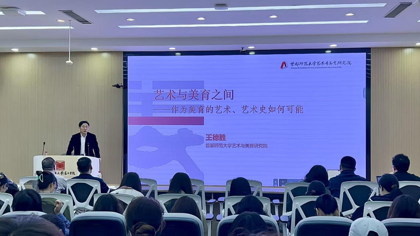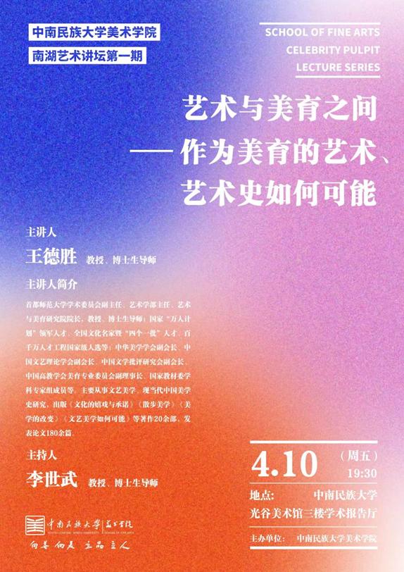 2026年4月10日晚,美术学院南湖艺术讲坛在美术馆三楼学术报告厅如期开讲。作为南湖艺术讲坛的第一期讲座,本次讲坛由中南民族大学美术学院李世武院长主持,特邀首都师范大学艺术与美育研究院院长王德胜教授主讲,围绕“艺术与美育之间—作为美育的艺术,艺术史如何可能”这一主题进行讲授。