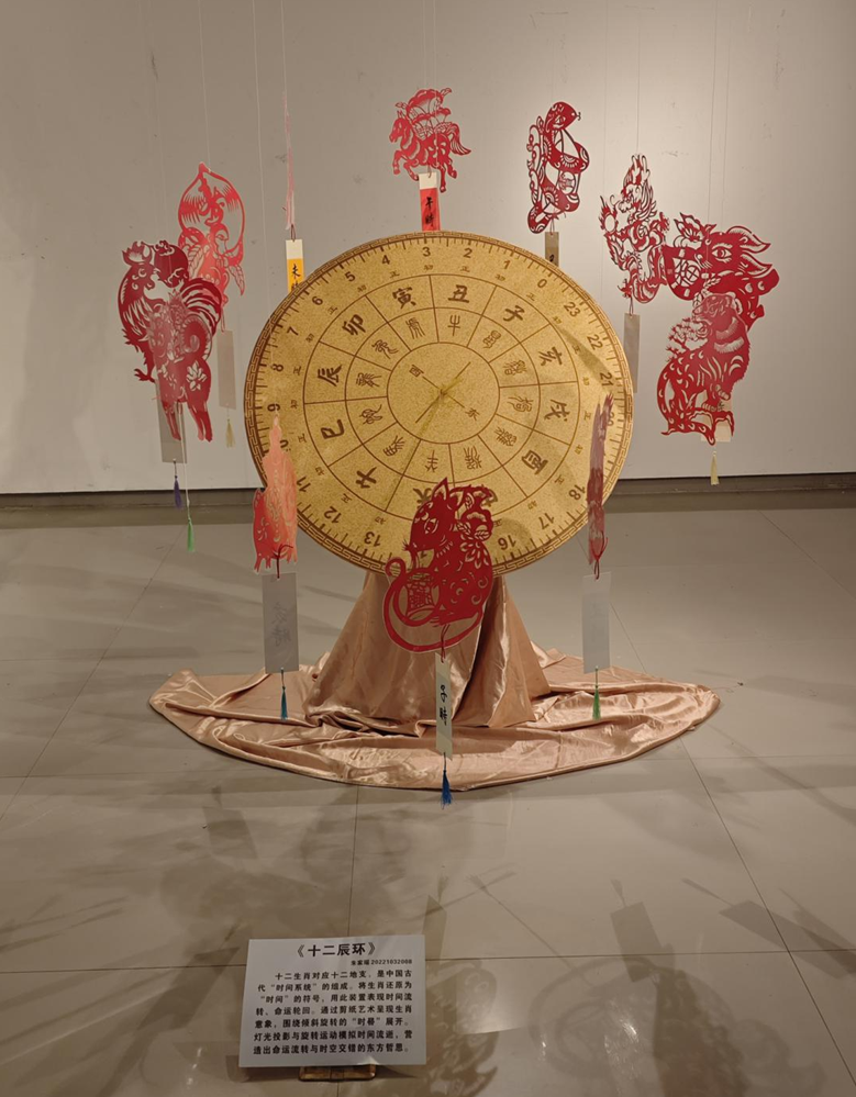 作品说明:十二生肖对应十二地支,是中国古代“时间系统”的组成。将生肖还原为“时间”的符号,用此装置表现时间流转、命运轮回。通过剪纸艺术呈现生肖意象,围绕倾斜旋转的“时晷”展开。灯光投影与旋转运动模拟时间流逝,营造出命运流转与时空交错的东方哲思。