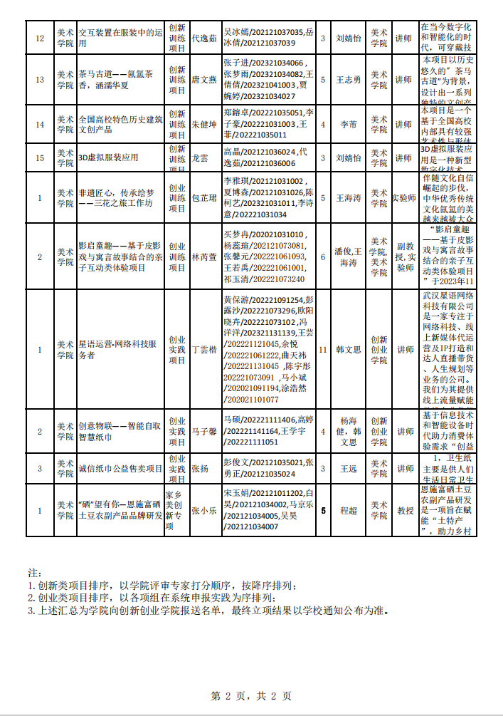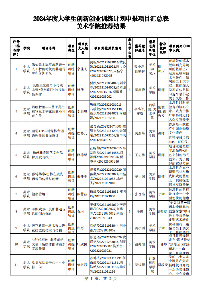 【大创项目】2024年度大学生创新创业训练计划申报项目汇总表-美术学院推荐结果
