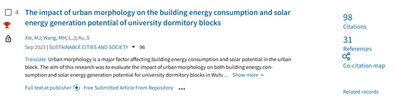 近日,我院环境设计系建筑学专业谢孟举老师作为第一作者于2023年发表在中国科学院一区期刊《Sustainable Cities and Society》上的研究论文“The impact of urban morphology on the building energy consumption and solar energy generation potential of university dormitory blocks” 成功入选ESI全球前1%高被引论文。这标志着该研究成果在全球学术界获得了广泛关注与高度认可,充分展现了其重要的学术价值和影响力。