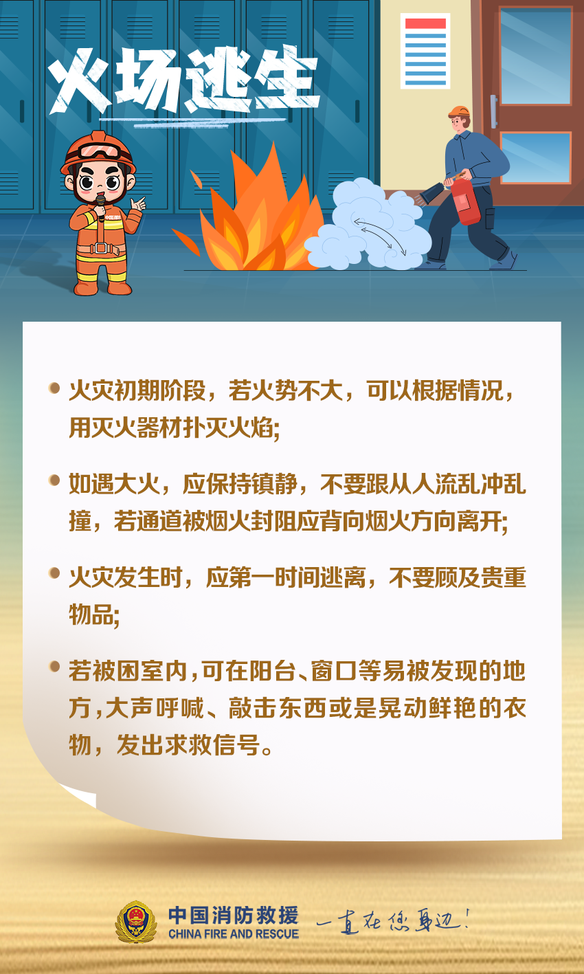 疏散逃生:保持冷静,用湿毛巾捂住口鼻,低姿前行,按照疏散指示标志有序撤离。