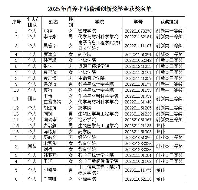 根据《中南民族大学肖养孝韩倩瑶奖(助)学金评选管理办法(试行)》和《关于组织开展2025年肖养孝韩倩瑶创新奖学金评选工作的通知》的要求,经学院组织报名、初审与推荐,共收到17个学院的67项报名材料。经剔除今年国家奖学金评选的获得者等无效申报材料,余下58份有效申报团队或个人材料。