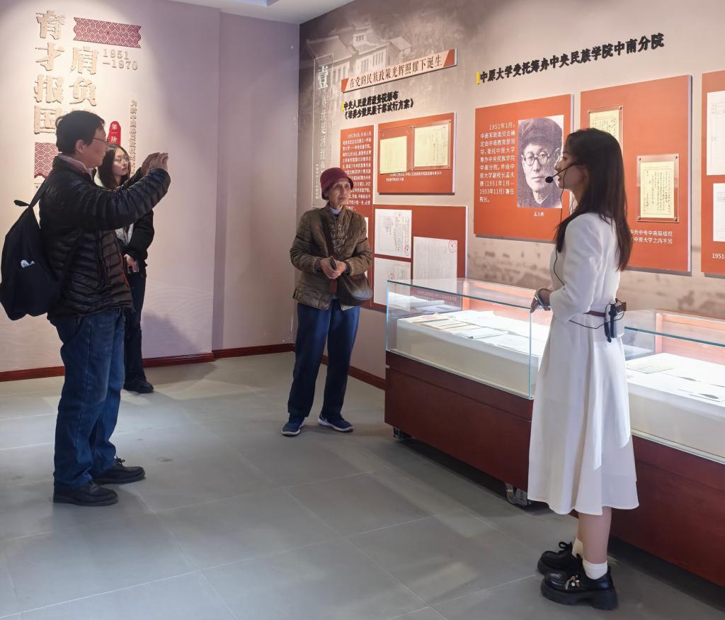 李华女士与孟青先生认真聆听了以孟夫唐、徐少岩、熊寿祺、李守宪等为代表的老一辈革命家、教育家,在我校建校初期的奋斗历程与卓越贡献。1951年1月,中南军政委员会委托中原大学筹建中央民族学院中南分院,时任中原大学副校长的孟夫唐兼任分院院长,全面主持学校的选址、校舍建设与学员征调等工作。同年11月29日,学校第一期学员开学典礼在中原大学礼堂隆重举行,这一天也因此被确立为学校的校庆日。1952年11月,学校更名为中南民族学院,孟夫唐继续兼任院长,确保了学校从筹建到独立办学的平稳过渡。学校于1957年7月更名为中央民族学院分院,1965年10月恢复中南民族学院名称,2002年3月更名为中南民族大学。