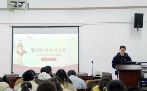 黄启帆以《繁荣社会主义文化 以全会精神为矩 照亮文化强国之路》为主题,系统梳理了“十四五”时期我国文化事业与文化产业的蓬勃发展成就——马克思主义意识形态指导地位持续巩固,公共文化服务体系覆盖城乡,文化遗产保护传承与国际传播效能显著提升。在此基础上,他深入解读“十五五”规划中文化建设的核心目标与关键举措,结合“AI蜀锦”赋能非遗传播、湖北宣恩推进文旅融合等鲜活案例,阐述了文化数字化转型与文旅深度融合的实践路径。他呼吁青年学子主动投身校园文化建设与民族文化传播,通过“笔友计划”“红色调研”等活动,铸牢中华民族共同体意识,以青春之声讲好中国故事,以青年之力传播民族声音。