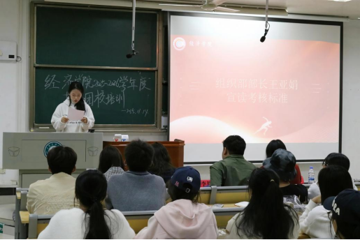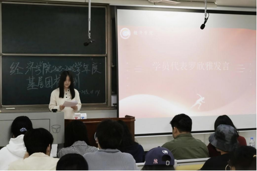 为深入学习贯彻习近平新时代中国特色社会主义思想,进一步加强基层团组织建设,推进团员青年学习的专业化、规范化、标准化,11月14日,经济学院2025-2026学年度"石榴籽·青年马克思主义者培养工程"基层团校开营仪式在15栋103教室举行,开营仪式后,基层团校第一讲同步开讲。经济学院团委副书记李恩朴、2025级辅导员赵驰、团委学生副书记林丽彬、团委组织部部长王亚娟及学院团委、学生会全体干事、2025级班长团支书、2025年上半年新发展团员参会。会议由高玉坤主持。