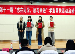 薪火相传结硕果,榜样力量引前行。仪式现场对第十期学业帮扶活动优秀个人进行表彰:张蕾、王紫涵、文心妤三位同学荣获“优秀志愿者”称号,王扬靖、周语、谭昕怡、李旭四位同学荣获“优秀学员”称号。张竹云、赵驰老师为获奖同学颁奖。此项荣誉既是对优秀个人的充分肯定,也为全体参与者注入奋进动力,进一步营造了比学赶超、互助共进的良好氛围。