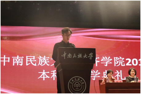 2017级学生代表韩启辰以自己两年多的民大求学经历,建议同学们珍惜现有的良好学习环境,积极开拓进取,在实践中成长与创新,培养自己科学精神与文化底蕴,做善学、善为、善良、善成的追梦人。2019级新生代表茶丹颖表达了来到民大的喜悦之情以及对未来的憧憬和期待。她代表新生表态,要尽快适应大学生活,学会独立;要树立规范意识,严于律己;要团结友爱,热爱生活;要刻苦学习,开拓创新。