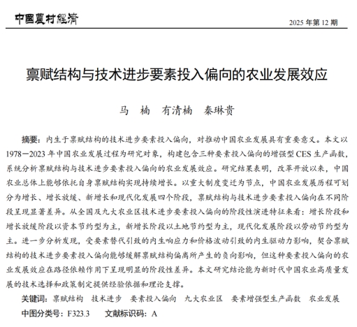 近期,经济学院马楠副教授团队在农业现代化发展领域取得新研究进展,研究成果《禀赋结构与技术进步要素投入偏向的农业发展效应》在经济学领域权威期刊《中国农村经济》上发表。马楠副教授为论文第一作者,其所指导的理论经济学硕士研究生有清楠为第二作者,我校为第一单位。
