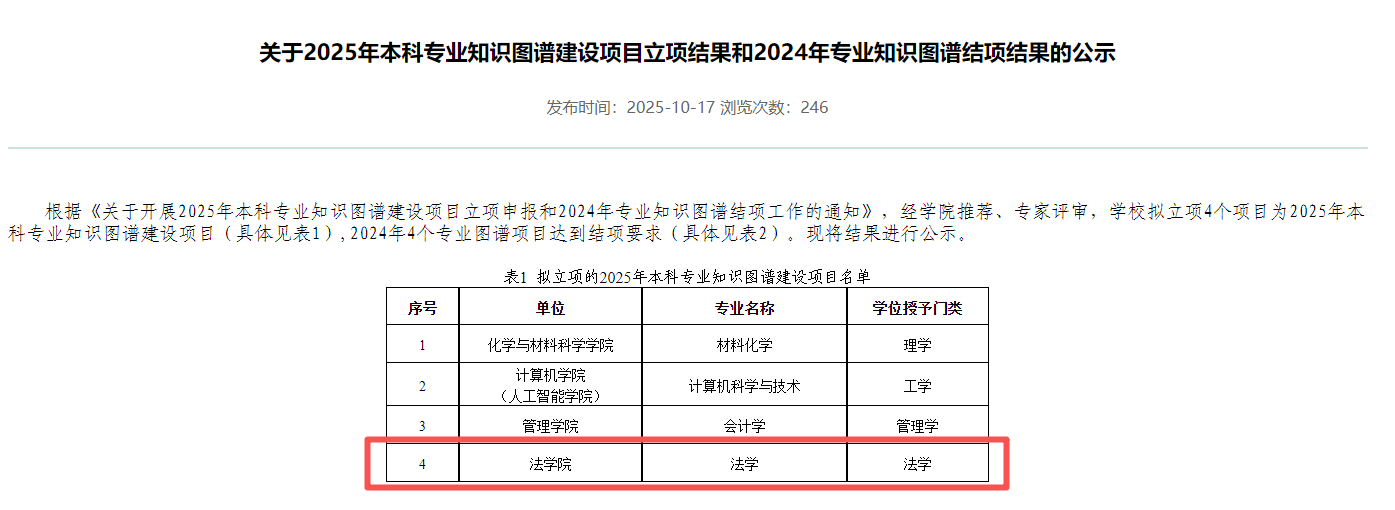近日,本科生院公示2025年本科专业知识图谱建设项目立项结果,法学院申报项目成功获批,标志着学院在法学教育数字化转型上取得重要突破。