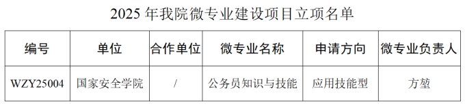 近日,我校2025年微专业建设项目评审结果正式公布,由国家安全学院申报的“公务员知识与技能”微专业成功获批立项,成为学校本年度重点建设的4个微专业之一。