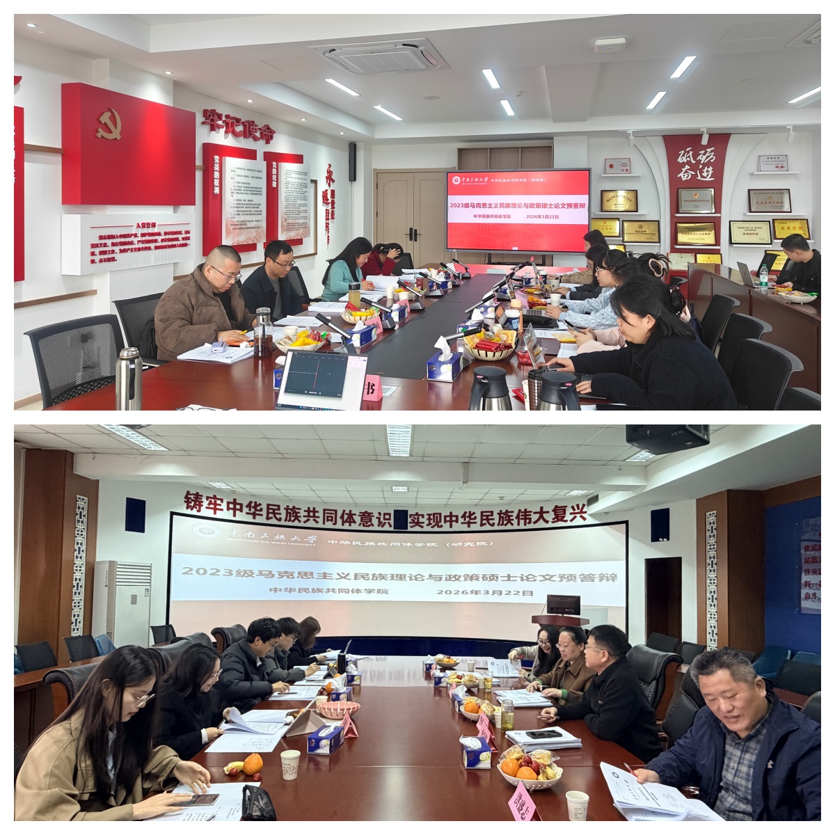 3月22日,我院2023级马克思主义民族理论与政策专业硕士研究生学位论文预答辩报告会在北书院顺利举行。本次预答辩分设北书院413、508两个会场同步进行,2023级全体12名硕士研究生参加预答辩。其中,413会场由副院长李学保教授担任答辩组长,叶慧教授、洪盛志副教授、彭茜、湛谌为答辩委员。508会场由李安辉教授担任组长,朱磊副教授、高俊山、刘晓雯、龚乔为答辩委员。