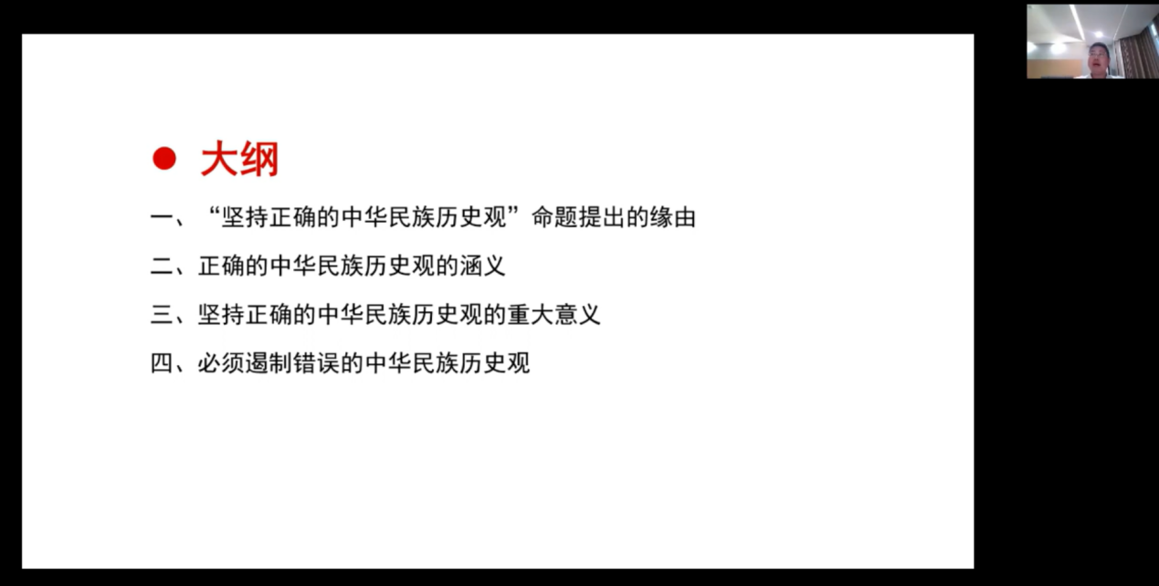 杨须爱以“第二讲 树立正确的中华民族历史观”为主题,围绕“坚持正确的中华民族历史观”这一核心命题,从命题提出的背景、内涵要义、重大意义以及错误史观的批判四个方面展开系统讲解。他指出,正确的中华民族历史观是铸牢中华民族共同体意识的根基,其深刻内涵集中体现为“五个共同”的重要论述。