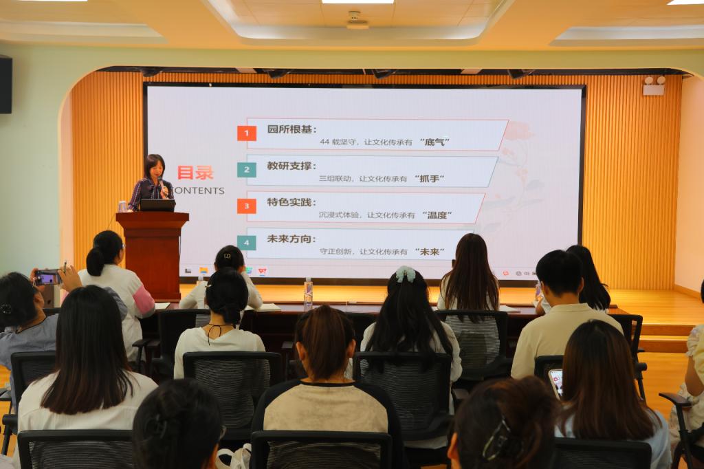 9月22日上午,园长李美菊向参加培训的教师全面且细致地介绍了园所的基本概况,并深入阐释了“自然和谐,美美与共”的办园理念。在后续参观园所环境的过程中,教师们发现,该理念已切实转化为环境中的生动实践:草木呈现出的生态和谐、师幼互动体现的人际和谐,以及多元文化元素交融达成的文化和谐,共同促使“自然和谐,美美与共”在每一处细节中得以充分彰显。