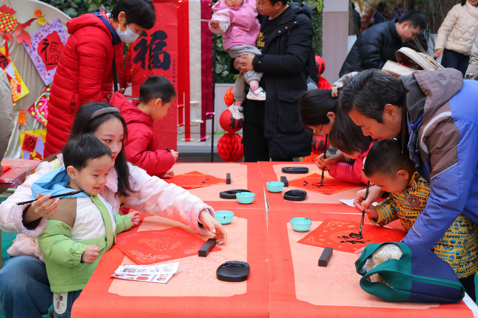 另一边的“五育集福”挑战区同样精彩纷呈。小二班门口的“爱的抱抱”游戏中,亲子用身体协作夹住气球往返穿梭,默契配合中增进了亲密感;二号操场的书写“福”字活动里,亲子携手握笔描红,在笔墨香中感受书法文化韵味,亲手书写的福字成为珍贵的新年纪念;三号操场的“福气宝宝向前冲”障碍赛上,亲子组队闯关梅花桩、攀爬体能垫,在奔跑跳跃中锻炼体能、收获勇气;“小马哒哒,新年哈哈”打卡地布置得年味十足,红灯笼与中国结相映成趣,集齐五福印章的家庭纷纷在此合影留念,定格温馨的亲子瞬间;“五谷丰登”游戏区,家长与孩子协作转移蔬菜抱枕,孩子们在抓取搬运中体会劳动乐趣,树立珍惜粮食的观念。“集福挑战”活动以五大游戏为载体,将五育理念融入各游戏环节,让亲子在趣味互动中全方位成长,推动“五育并举”理念落地生根。
