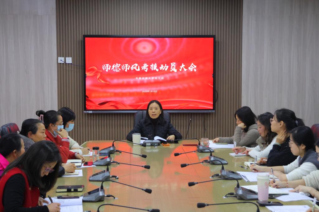 1月16日下午,中南民族大学幼儿园召开全体教职工大会。会议以“锤炼师德修养、强化育人担当”为核心主题,正式启动2025年度师德师风考核工作,同步复盘全年工作亮点,并对新学期重点任务作出部署。园长李美菊主持会议并作动员讲话。