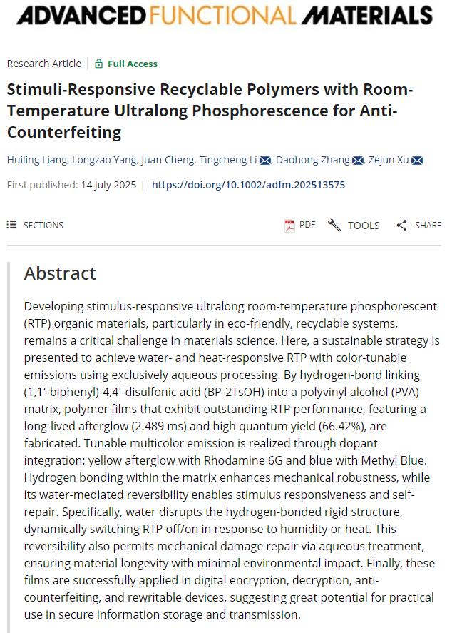 Huiling Liang, Longzao Yang, Juan Cheng, Tingcheng Li*, Daohong Zhang*, Zejun Xu*, Stimuli-Responsive Recyclable Polymers with Room-Temperature Ultralong Phosphorescence for Anti-Counterfeiting, Advanced Functional Materials, 2025, e13575, DOI: 10.1002/adfm.202513575.