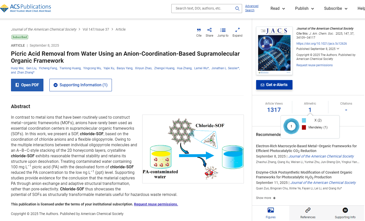 Huiqi Wei, Gen Liu, Yicheng Fang, Tianlong Huang, Yingcong Wu, Yajie Xu, Baoyu Yang, Xinyun Zhao, Zhengxi Huang, Hua Zhang, Lamei Wu*, Jonathan L. Sessler,* and Zhan Zhang* “Picric Acid Removal from Water using an Anion-Coordination-Based Supramolecular Organic Framework” J. Am. Chem. Soc. 2025, ASAP
