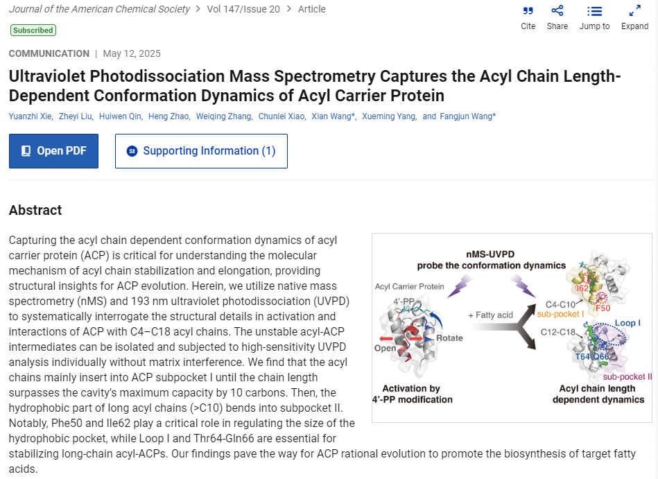 Prof. Wang's team made new progress in capturing the acyl chain length-dependent conformation dynamics of acyl carrier protein using UV photodissociation MS. Their results were published at JACS on May 12, 2025! Congratulations!