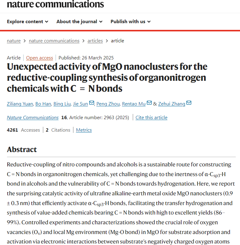 Ziliang Yuan, Bo Han, Bing Liu, Jie Sun*, Peng Zhou, Rentao Mu*, Zehui Zhang*,Unexpected activity of MgO nanoclusters for the reductive-coupling synthesis of organonitrogen chemicals with C = N bonds. Nat. Commun. 2025, 16, 2963.