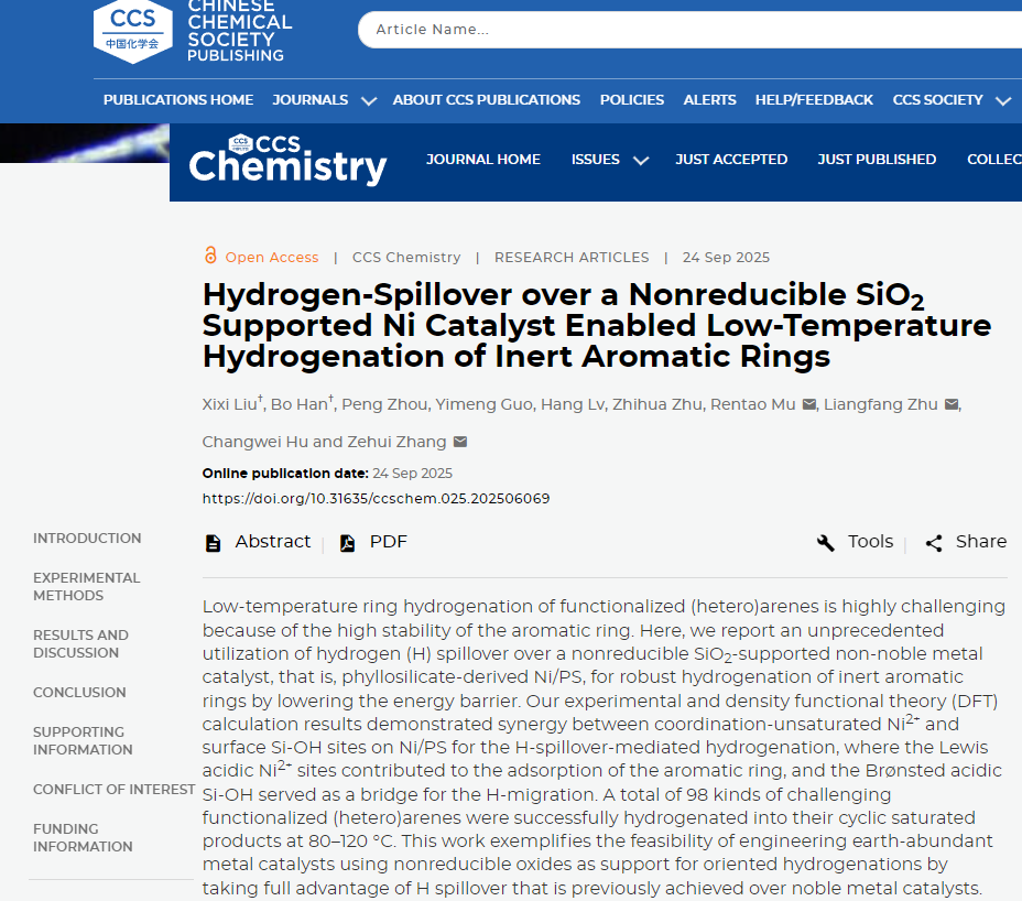 Prof. Zehui Zhang's team made new progress in hydrogen spillover effect of non-precious metal (Ni)- non-reducible oxide support (SiO2) . Their results were published at CCS Chemistry, the flagship journal of the Chinese Chemical Society on Sept. 24th, 2025! Congratulations!