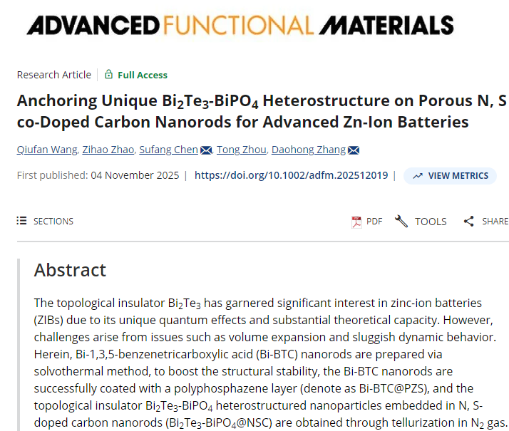 The title of the paper is 'Anchoring unique Bi2Te3-BiPO4 heterostructure on porous N, S co-doped carbon nanorods for advanced Zn-ion batteries'.