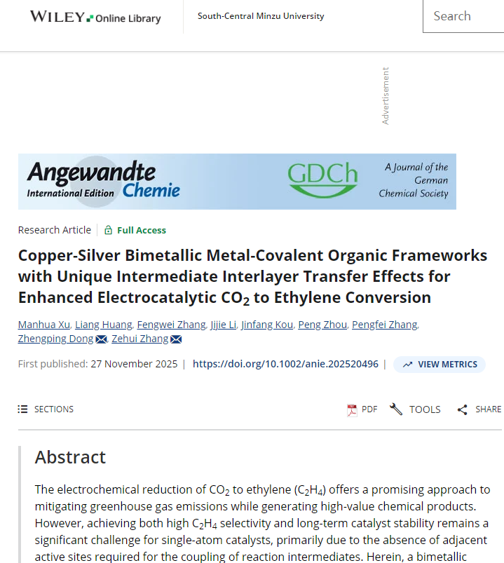 Professor Zhang Zehui's research group reported a bimetallic metal-covalent organic framework (MCOF) catalyst with precisely tunable Cu-Ag spatial configurations for electrocatalytic CO2 reduction to ethylene. The results were published at Angewandte Chemie International Edition on Nov. 27th, 2025! Congratulations!