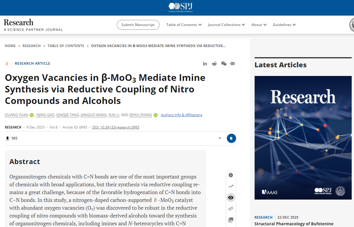 Prof. Zehui Zhang made new progress in a nitrogen-doped carbon-supported molybdenum oxide nanoparticle catalyst enriched with oxygen vacancies (Mo/NC-500). The results were published at Research, the Science partner journal on Dec. 9th, 2025! Congratulations!