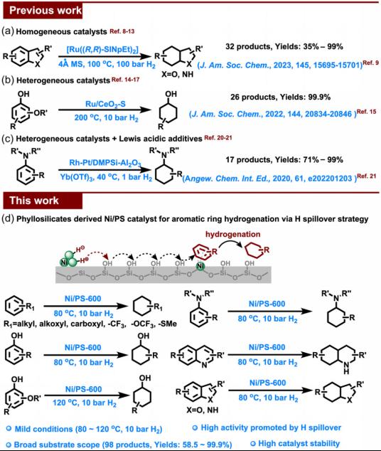 氢溢流是多相催化加氢中的一种独特效应,通过活性氢从金属向载体迁移,可有效降低加氢反应的活化能垒,从而提高催化加氢反应效率。该研究通过层状硅酸盐还原热解制得Ni纳米颗粒均匀分散的Ni/SiO2催化剂,该催化剂金属Ni掺入载体SiO2基质中,使得载体表面存在丰富的配位不饱和Ni2+位点(Lewis酸位点)和Si-OH基团(Brønsted酸位点)。前者通过吸附不饱和底物分子为氢迁移提供势能;后者为氢迁移提供介质,二者与Ni纳米颗粒协同促进非还原性SiO2载体与Ni纳米颗粒间的氢溢流,实现温和条件下(80-120 °C,H2 10 bar)高效加氢还原烷基苯、(N-取代)苯胺、苯酚和烷氧基取代苯酚等>98种(杂)芳环。