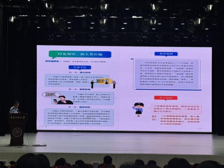 然后,吴警官将焦点转向“非法校园贷”这一隐形陷阱。他用翔实的数据和触目惊心的案例,清晰阐述了非法校园贷的欺诈本质、严重危害及衍生风险,警示同学们树立理性、健康的消费观,远离各类非法金融活动。