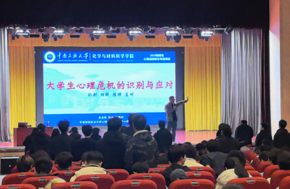 2025年11月10日晚,中南民族大学化学与材料科学学院特邀中南财经政法大学心理健康教育中心余金聪副教授,在学术会堂成功举办了一场以“大学生心理危机的识别与应对”为专题的心理健康讲座。本次讲座旨在提升学生对心理危机的认知与应对能力,营造积极健康的校园环境,吸引了学院各年级尤其2025级新生的广泛参与。