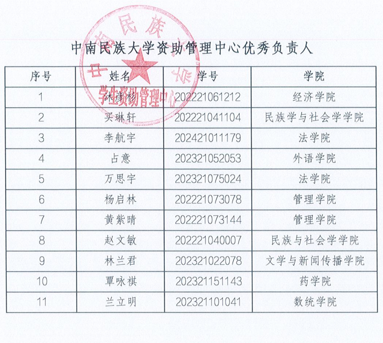 根据《中南民族大学学生资助管理中心学生团队先进个人评选条例》,遵循公开、公平、公正的原则,经个人申报、团队评选、学生资助管理中心审议等环节,最终在4个团队中评选出优秀负责人11名,优秀成员18名,现将评选结果公示如下(排名不分先后):