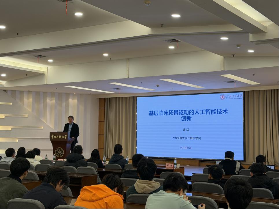 2025年11 月 20 日,中南民族大学计算机学院(人工智能学院)主办的学术讲座《基层医疗需求驱动的人工智能技术创新》在学术交流中心二楼润良报告厅举行。上海交通大学计算机学院人工智能教育部重点实验室教授、博士生导师盛斌应邀主讲,计算机学院(人工智能学院)党委书记潘宏飞,党委副书记、院长帖军,副院长张潇,网络空间安全系党支部书记朱剑林、系主任王俊,人工智能系主任康怡琳,生物医学工程学院周到、深圳大学温阳、华中科技大学同济张宇聪、武汉工程大学陈灯、武汉纺织大学黄晋等嘉宾出席,会议由张潇主持,参会师生共同探讨人工智能与医学交叉领域的前沿发展。