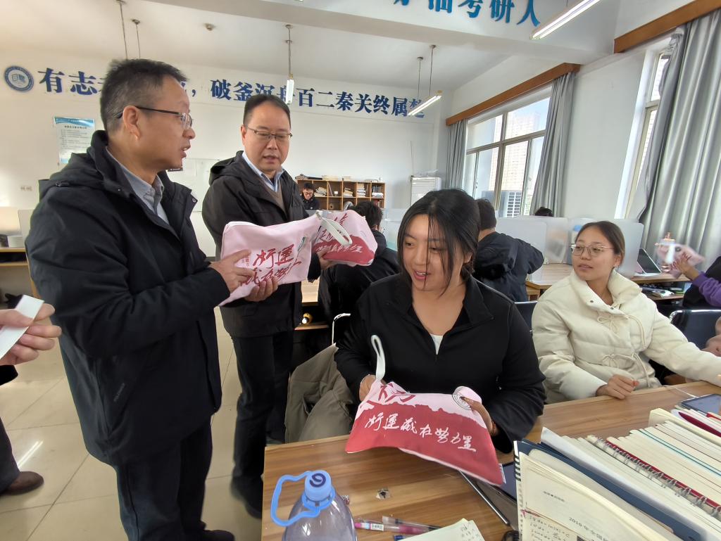 活动现场,阳光透过窗棂洒在堆满复习资料的桌面上,学院领导与老师们手持沉甸甸的考研大礼包,逐一走到学子身边递上这份 “冬日暖礼”。礼包内精心搭配了实用备考物资:印有 “笃信好学 自然宽和” 校训的定制笔记本,方便记录高频考点;小巧便携的暖手宝,为寒冬刷题的学子驱散凉意;精选的考场实用文具包,助力学子考试顺利;还有手写祝福卡片,一句句 “落笔有神,金榜题名”“全力以赴,未来可期” 的寄语,让每一件备考物资都饱含学院的暖心关怀。