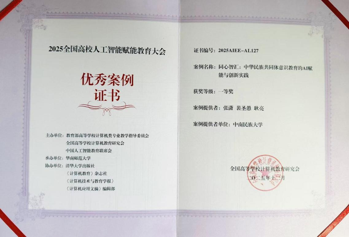《同心智汇:中华民族共同体意识教育的AI赋能与创新实践》(证书编号:2025AIEE-AL127):该案例由张潇、裴圣愚、耿亮团队提供。该项目紧密结合我校办学特色,通过人工智能技术赋能中华民族共同体意识教育,实现了思政教育与前沿技术的创新融合,为新时代民族团结进步教育提供了数字化解决方案。