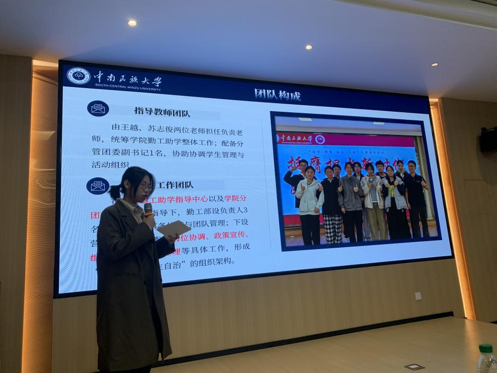 据悉,2025年11月28日,中南民族大学2024-2025年度勤工助学先进集体答辩会在荷香会议厅顺利举行。答辩现场,勤工部代表黄佳琪同学以清晰的逻辑、翔实的数据和生动的案例,全面展现了学院勤工助学工作的实践成果,以及勤工部的未来规划和目标。学院勤工团队不仅在助学金评定审核、资助政策宣传、勤工助学岗位管理等方面取得优异成绩,更以积极的工作态度和扎实的工作成效,获得了评委团的高度认可。