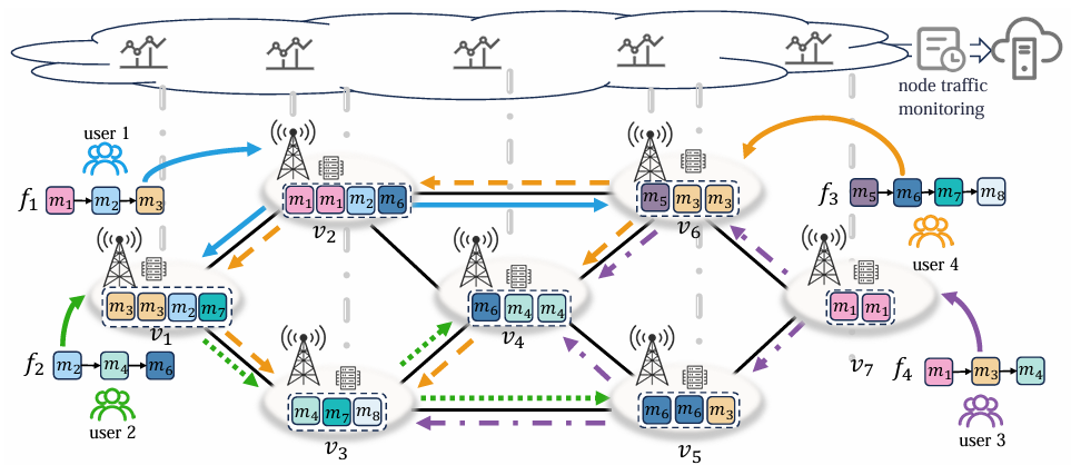 陈洋助力完成的论文“Intelligent autoscaling of microservice and request routing for dynamic service requests”(发表于IEEE Internet of Things Journal),针对移动边缘计算中微服务动态部署难题,构建请求路由与实例伸缩联合优化模型,实现了时延约束下的部署成本最小化,为高并发场景下的网络服务质量保障提供新路径(如图3)。
