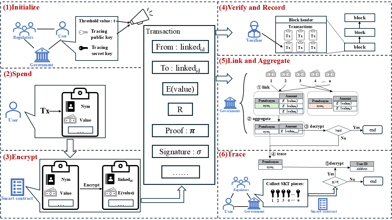 为了解决这个问题,该论文提出了可链接分布式监管标签(LDRT)方案,该方案通过利用Paillier同态加密和秘密共享,在不改变交易结构的情况下实现交易可链接性和可追溯性。在此基础上,还提出了一种具有数据主权的去中心化匿名支付框架(DAPDS),这是第一个支持用户数据主权的去中心化匿名区块链交易监管框架。