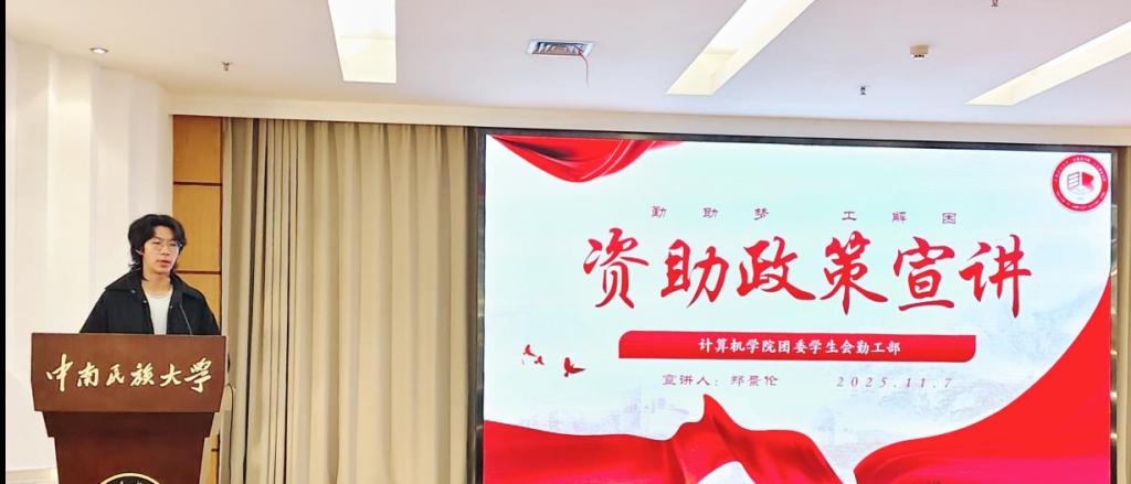 随后,学院团委学生会勤工部郑景伦同学为在场同学进行了“勤助梦·工解困”的资助政策宣讲,重点宣讲了学校的“奖、助、贷、勤、减、免、补”七位一体的资助工作体系,讲解国家的助学贷款、奖学金、助学金以及学校的补助与减免政策,并介绍了学院的勤工助学工作。