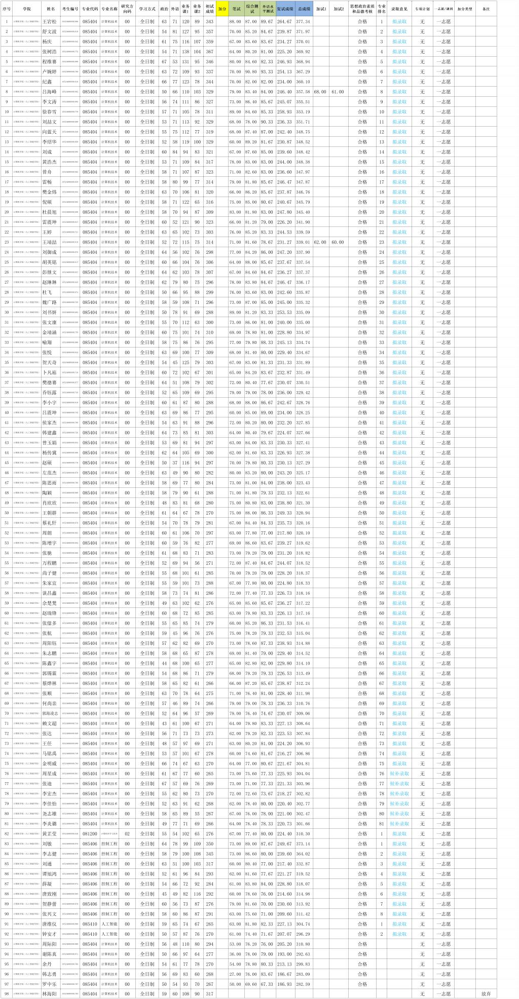 中南民族大学计算机学院(人工智能学院) 2026年硕士研究生复试成绩公示