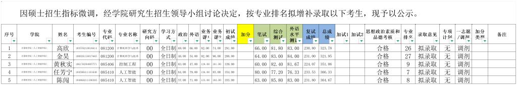 计算机学院(人工智能学院)2026年硕士研究生拟增补录取名单【调剂】