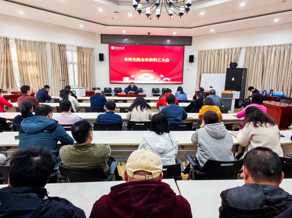 3月12日下午,本科生院在八角楼一楼报告厅召开全体会议,传达学习《中南民族大学2026年工作要点》,部署本科人才培养重点工作。本科生院院长胡军浩主持会议并讲话,本科生院全体教职工参加会议。