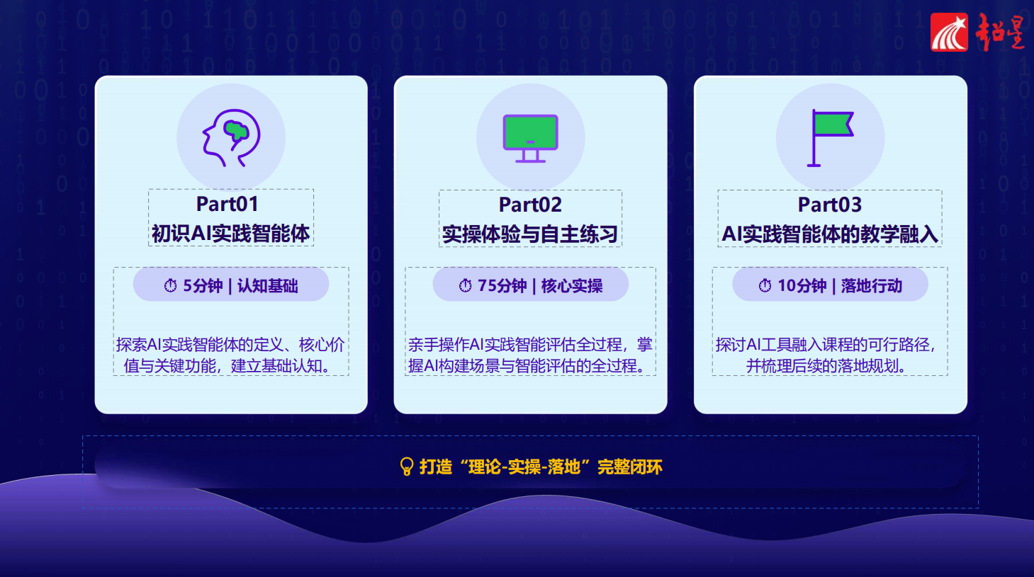 培训内容结合国家教育数字化政策要求,系统介绍了AI实践智能体在教学中的突破性价值及其六大核心功能模块。覆盖情景对话、上传作品、思维阶梯、代码编辑、思辨擂台、口语通练等全学科应用场景,并通过多校实际教学案例展示了实践智能体在实验操作评估、作业智能批改、情景模拟训练、思维能力测评等场景的应用效果。