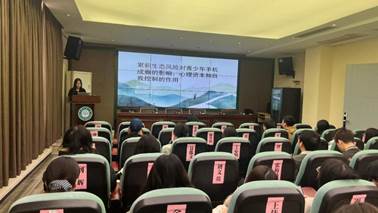 会议开始,25级心理健康专业干潇涵同学分享了《累积生态风险对青少年手机成瘾的影响:心理资本和自我控制的作用》一文。她谈到,这篇论文系统阐述了家庭、学校、社会与网络四类生态风险如何协同影响青少年手机使用行为,并在此基础上呼吁四轴联动,共同构建青少年心理健康防护网。