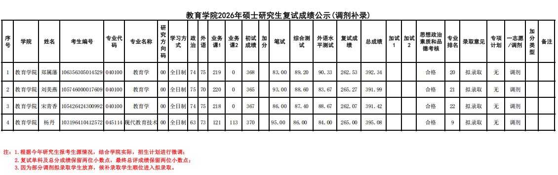 教育学院2026年硕士研究生复试成绩公示(调剂补录)