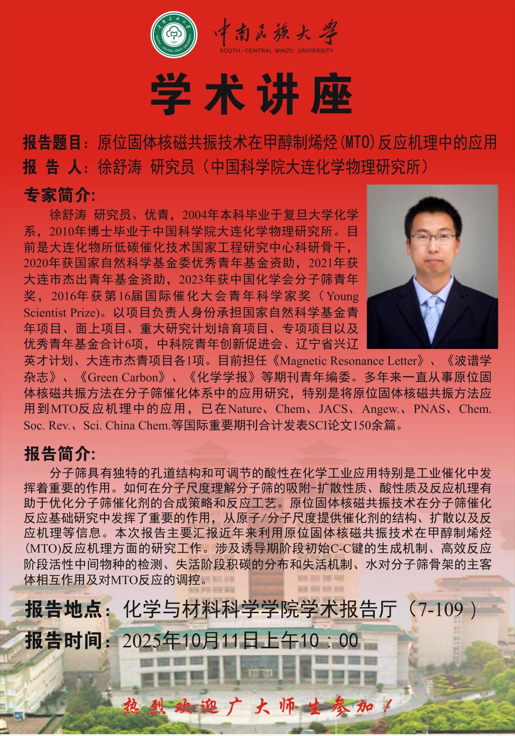 【学术预告】原位固体核磁共振技术在甲醇制烯烃(MTO)反应机理中的应用