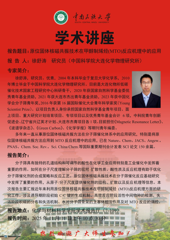 【学术预告】原位固体核磁共振技术在甲醇制烯烃(MTO)反应机理中的应用