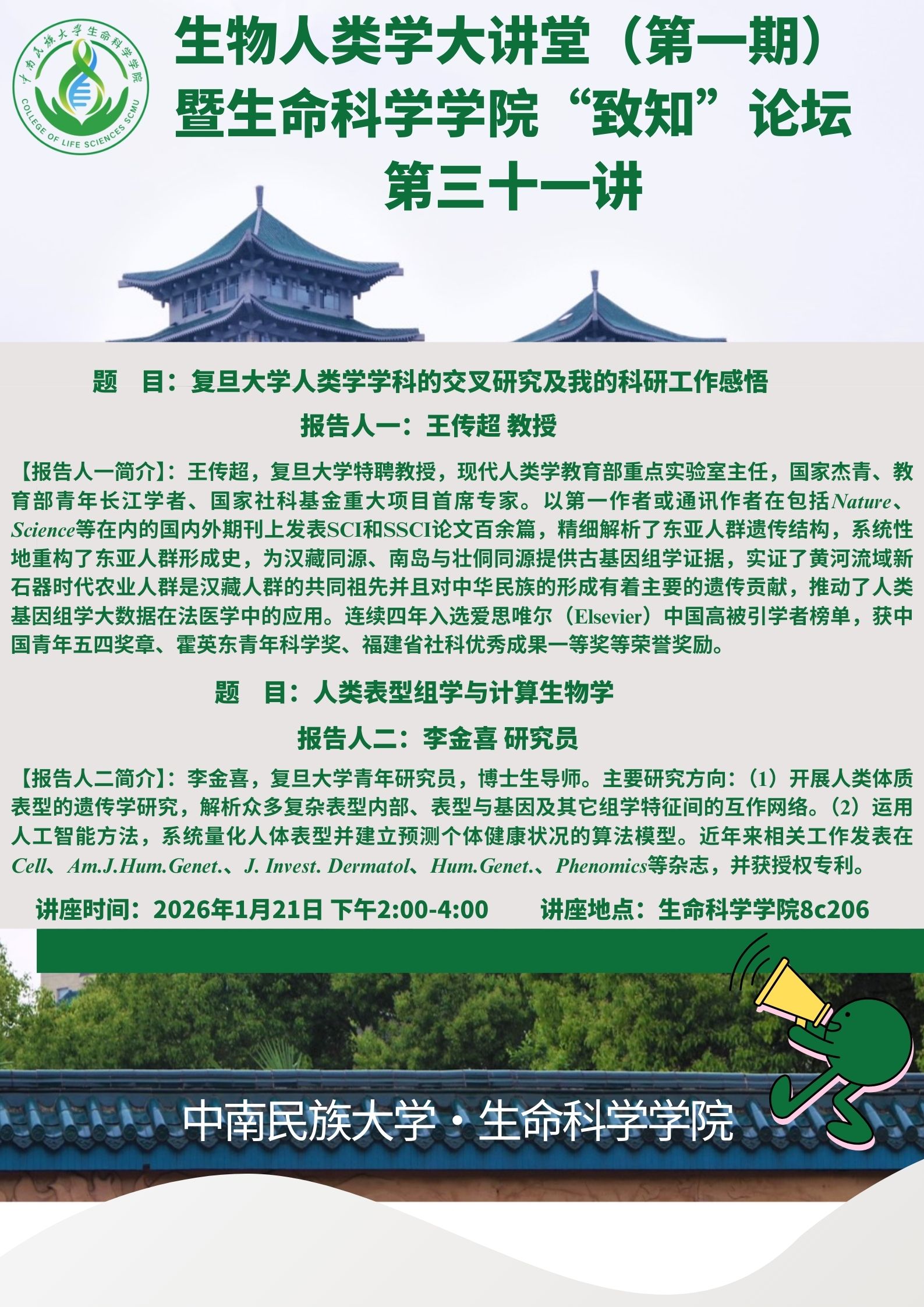 【学术预告】复旦大学人类学学科的交叉研究及我的科研工作感悟/人类表型组学与计算生物学
